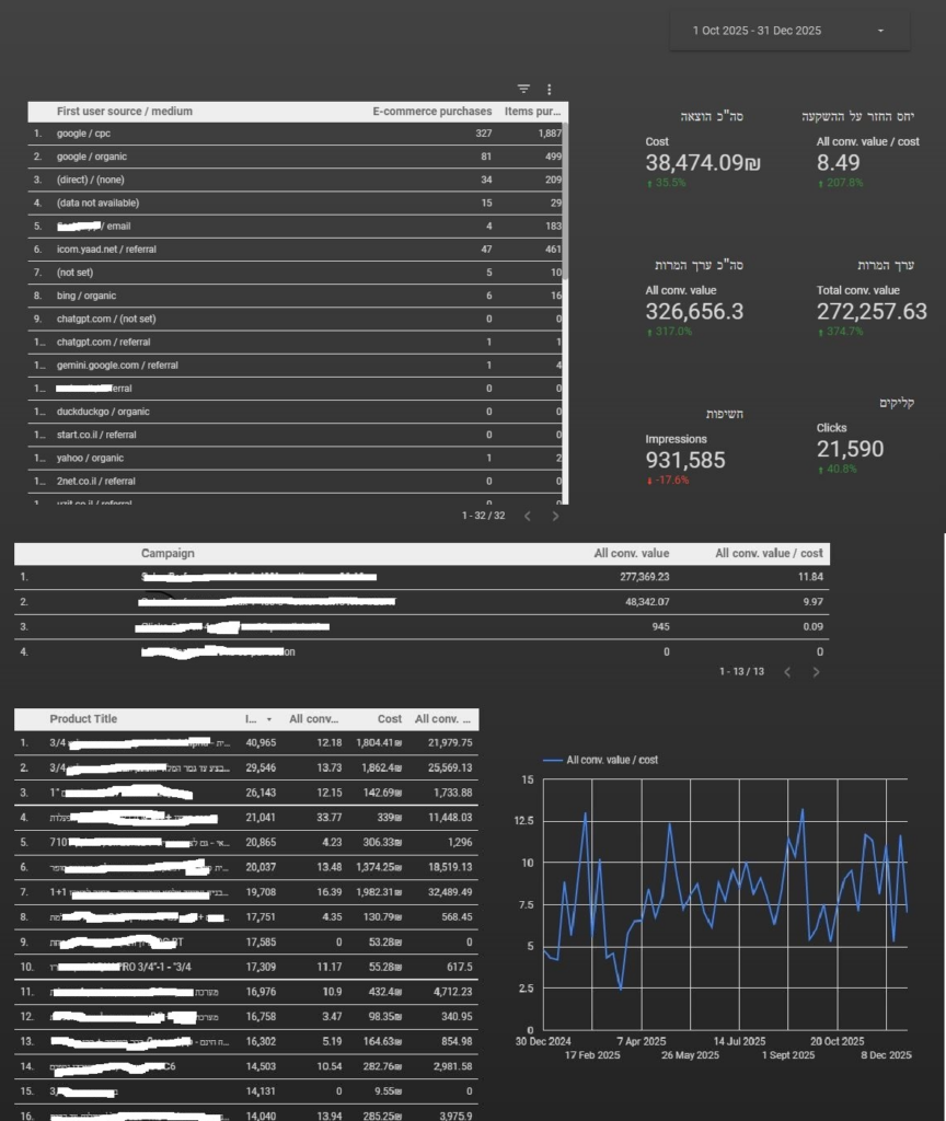 6. בניית אמון וניהול ROI מדיד – גולשים בורחים מאתרים שמרגישים להם "חשודים". סימני אמינות כמו המלצות של לקוחות, כתובת העסק, נראות, אבטחה והצגת ה"פנים" שמאחורי העסק הם קריטיים לשיפור ההמרה. אך אמון הוא לא רק מול הלקוח, אלא גם מול הנתונים שלכם. אנחנו משתמשים בדאשבורדים המשלבים נתונים ממערכות הפרסום ומערכת האתר, מה שמאפשר שיפור מבוסס רווח ולא רק קליקים חשיפות. כך הגענו עם לקוח איקומרס שלנו להחזר השקעה (ROI) של פי 8.49 – כי ידענו בדיוק איזה מוצר מכניס כסף ואיזה סתם שורף תקציב.