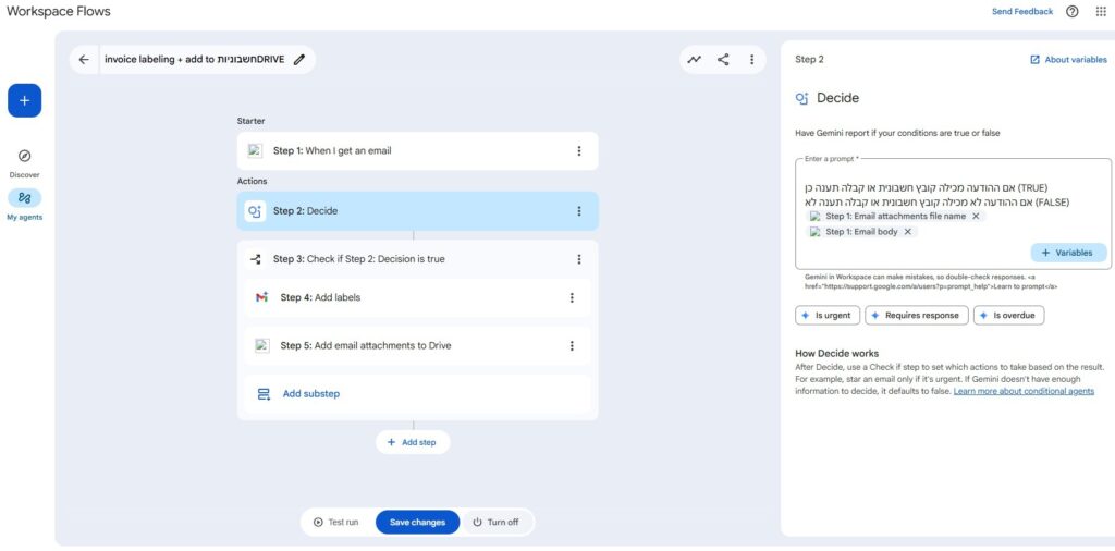 Gemini קורא את נושא המייל, התוכן והקבצים המצורפים (PDF, תמונה, Word), מזהה שמדובר במסמך כספי (חשבונית מס, קבלה, Invoice, Tax Invoice וכו'), ומוסיף תווית מתאימה במייל. לאחר מכן נבקש לשלוח את המסמך בצורה אוטמטית לתיקייה מסודרת ב-Drive.